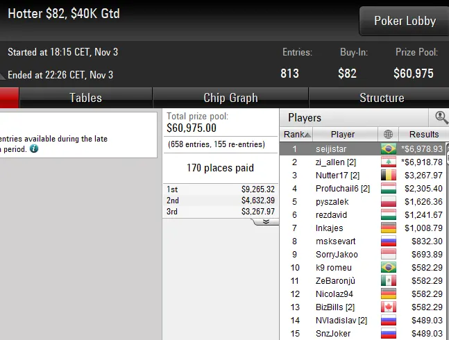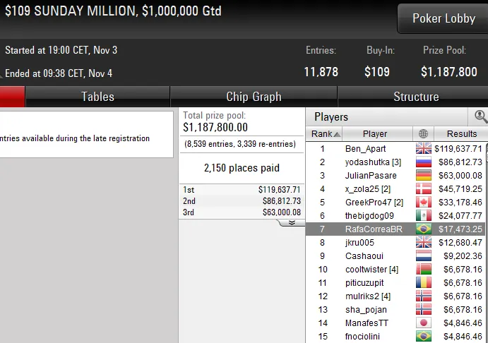 Quem também forrou uma premiação de cinco dígitos na reta deste domingo foi Marcelo "marceloaziz" Aziz. O brasuca superou 1.485 entradas no US$ 109 Sunday Cooldown [8-Max, Turbo PKO] para subir ao topo do pódio e receber um prêmio de US$ 17.033.