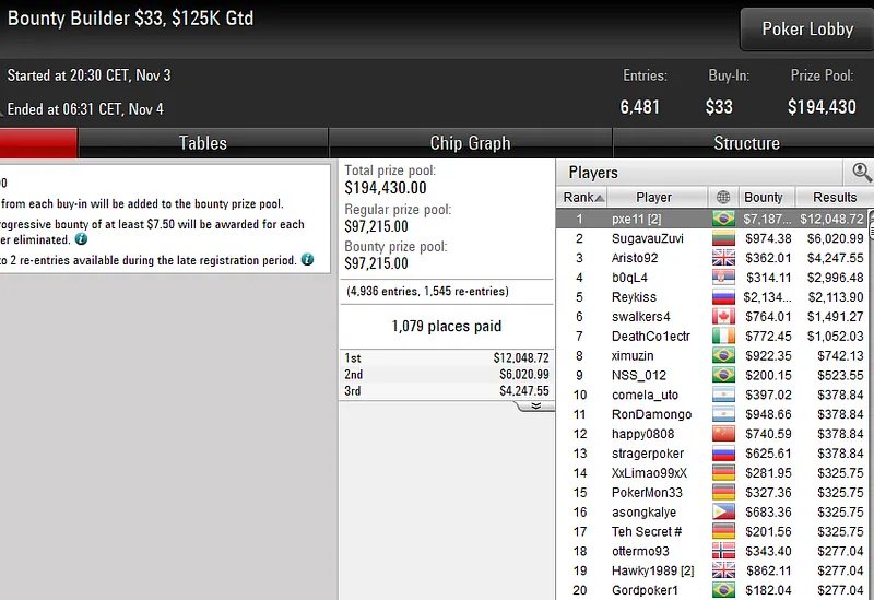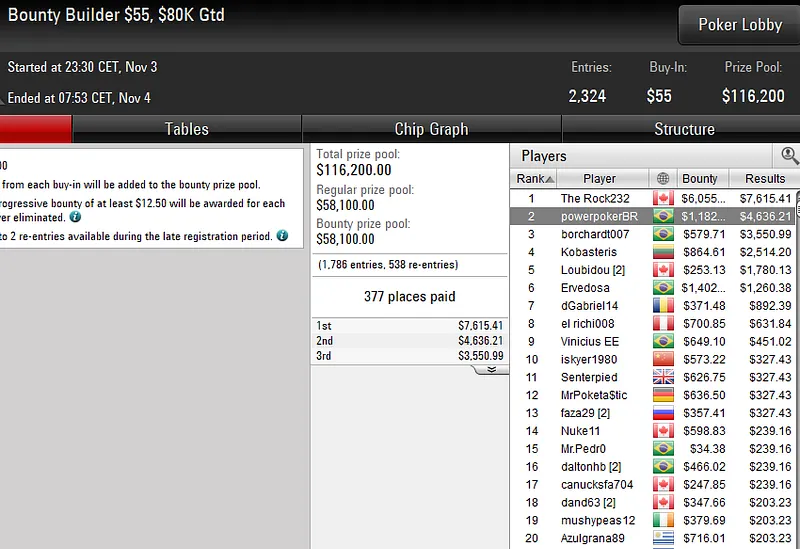 No Bounty Builder US$ 109, o Brasil ficou muito perto da vitória, com Bruno "great dant" Volkmann a colocar a bandeira verde e amarela no segundo lugar do pódio. O craque brasileiro garantiu a forra de US$ 28.547 após acordo no heads-up.