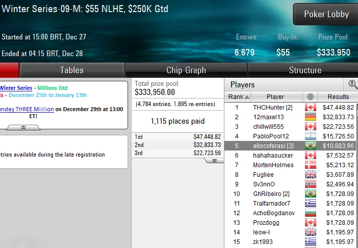 O grinder brasileiro ellocoferasi também forrou um prêmio de cinco dígitos, terminando na quinta colocação no Winter Series-09-M: US$ 55 NLHE para US$ 10.884. Já o dono da conta rodrigovini, levou a medalha de bronze e US$ 3.935 no Winter Series-08-L: US $11 NLHE [6-Max, PKO].