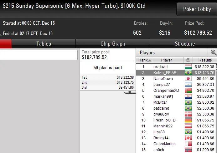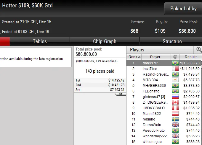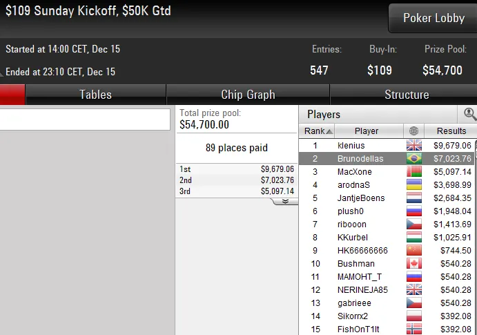 O torneio terminou após mais de 11 horas de jogo e com um acordo no heads-up entre dois brasileiros. luizcabo levou o título de campeão e um prêmio de US$ 17.187, enquanto arthurjdm faturou a medalha de prata e a forra de US$ 14.187.