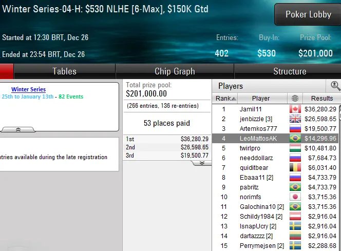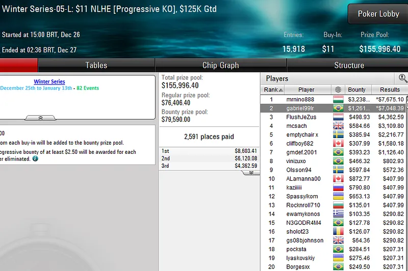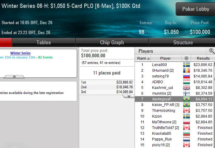 Outra das grandes forras do dia para o Brasil veio no Winter Series-05-H: US$ 1.050 NLHE [PKO, Thursday Thrill SE]. Este evento viu 376 jogadores (511 entradas) na briga por uma parte da premiação de US$ 511.000 e o brasileiro Lorenzo "charlie580" Bazei embolsou US$ 27.852 na quarta colocação.