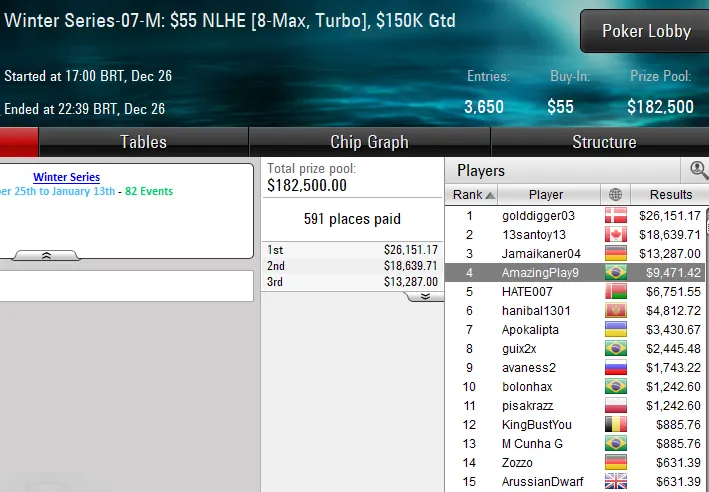Quem também soltou o grito de campeão na Winter Series foi o brasileiro Guilherme "Guizãoo_" Carmo. O craque do Samba Poker Team não deu chances para a concorrência no Winter Series-07-H: US$ 530 NLHE [8-Max, Turbo] e cravou o evento para levar a forra de US$ 40.420.