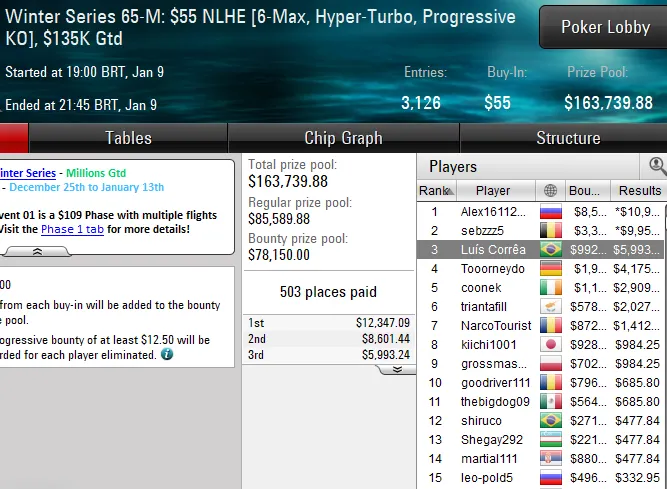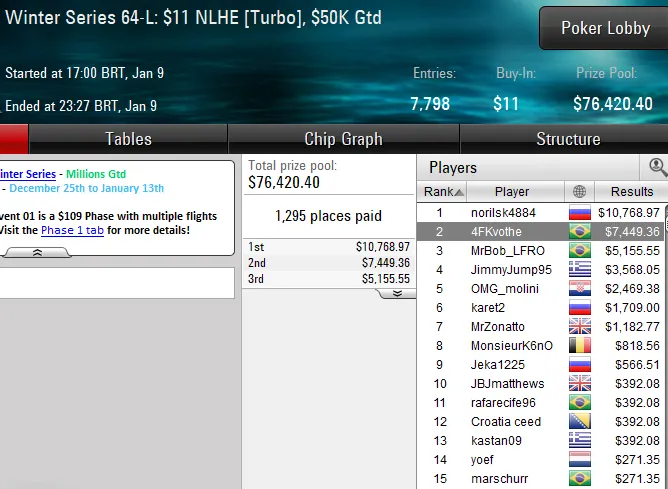 O dono da conta glnas foi o melhor entre o field de 2.935 entradas e conquistou o título e US$ 19.133 após acordo com o compatriota luucaspaaz, que embolsou US$ 17.229 na segunda colocação.