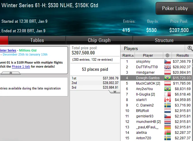 Quem também faturou uma premiação de cinco dígitos foi Eduardo Pires. Pilotando a conta edudrake1987, o profissional brasileiro foi nono colocado entre 121 entradas no Winter Series 58-H: US$ 5.200 NLHE [6-Max, High Roller] e engordou o bankroll com US$ 21.229.