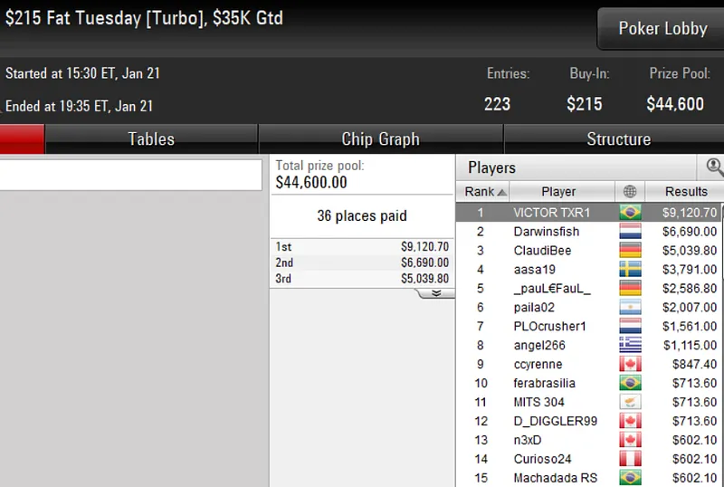Quem também engordou o bankroll com uma premiação de cinco dígitos no PokerStars foi Ricardo "riversouza" Souza. O brasuca garantiu a medalha de bronze entre um field de 99 jogadores no US$ 1.050 Super Tuesday do High Roller Club e foi recompensado com US$ 14.126.