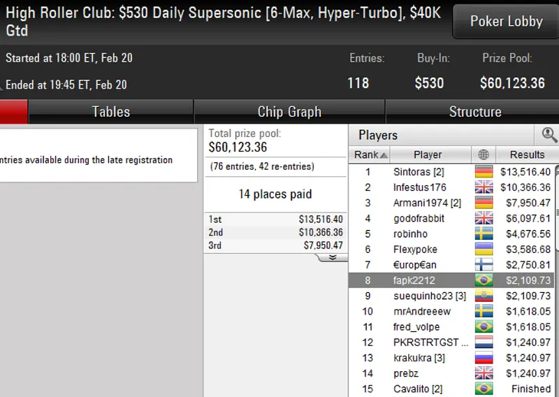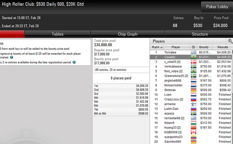 Neste mesmo torneio, o brasileiro dono da conta "felipecv" puxou US$ 6.391 ao terminar na quarta colocação.