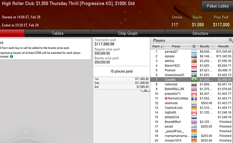 Mas não foi apenas no High Roller Club que os representantes das cores verde e amarelo engordaram seus bankrolls. O Brasil fez a dobradinha no US$ 109 Mini Thursday Thrill [Progressive KO].