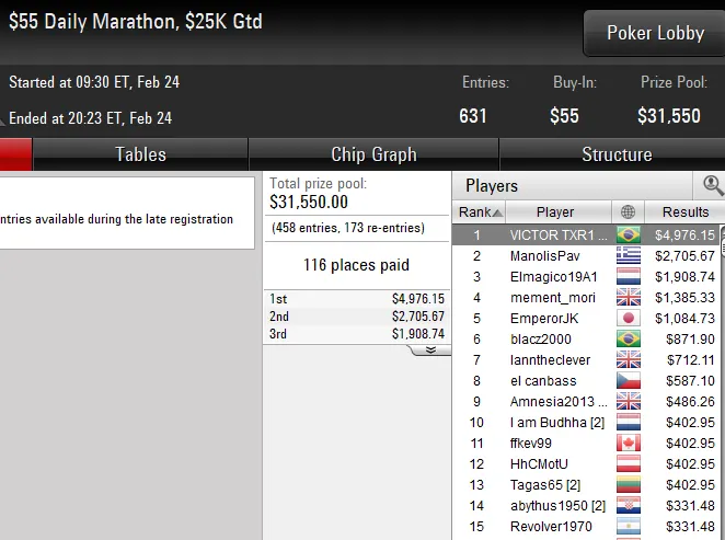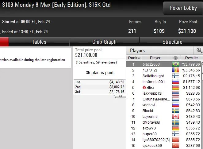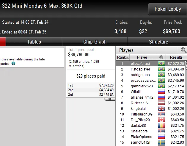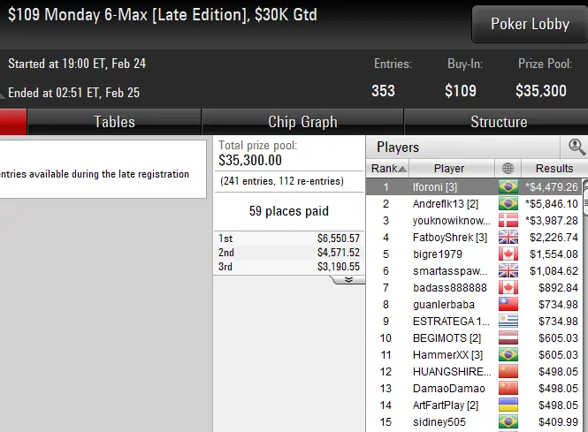 A edição de ontem deste torneio contou com um field de 259 entradas e uma premiação total de US$ 129.500. O grinder levou a melhor sobre todos os oponentes e subiu ao lugar mais alto do pódio para embolsar um prêmio total de US$ 26.601.
