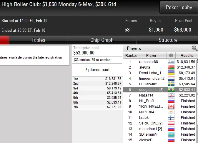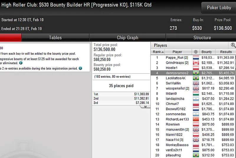 Quem também soltou o grito de campeão no High Roller Club foi Victor Teixeira. Pilotando a conta VICTOR TXR1, o brasuca despachou 26 oponentes, em um field de 39 entradas, no US$ 530 Daily 500 e forrou US$ 9.428.
