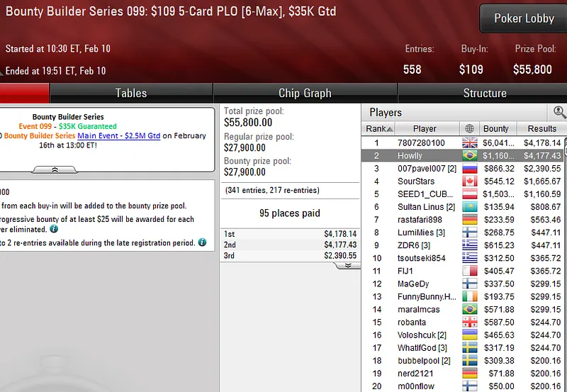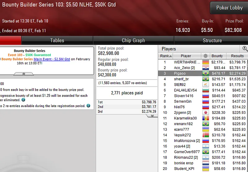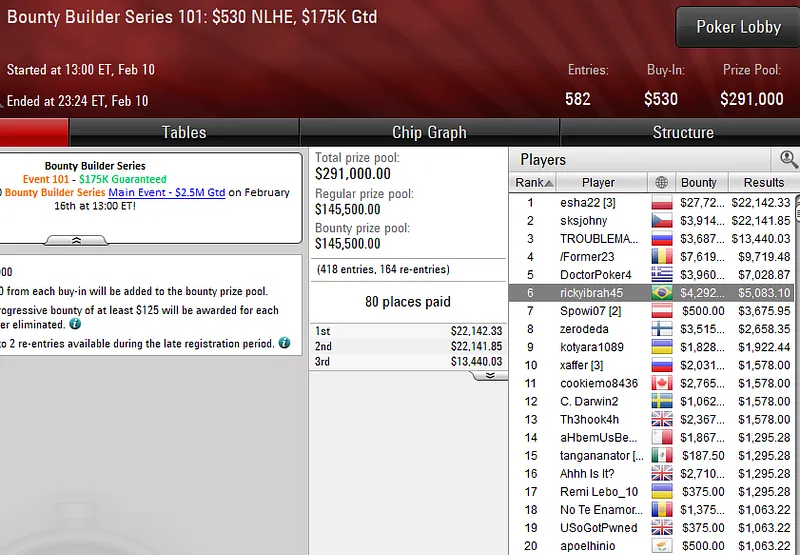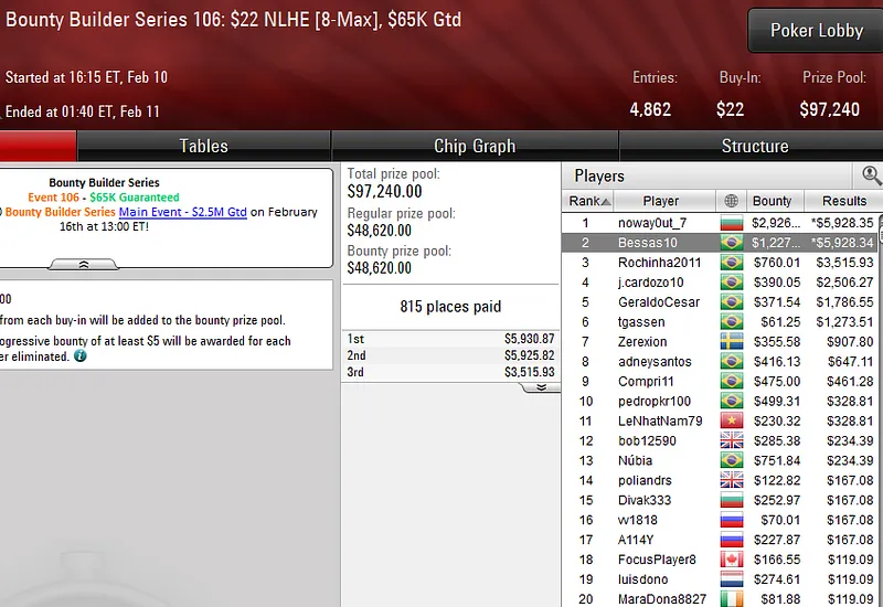 Já no festival Bounty Builder Series, a maior premiação verde e amarela foi conquistada no Evento #105: US$ 215 NLH 8-Max]. Lucas "sarxa" Sarxa terminou na terceira entre 801 participantes e levou para casa a medalha de bronze e US$ 10.418.