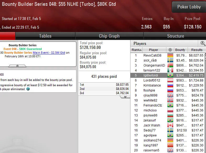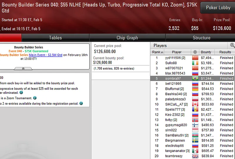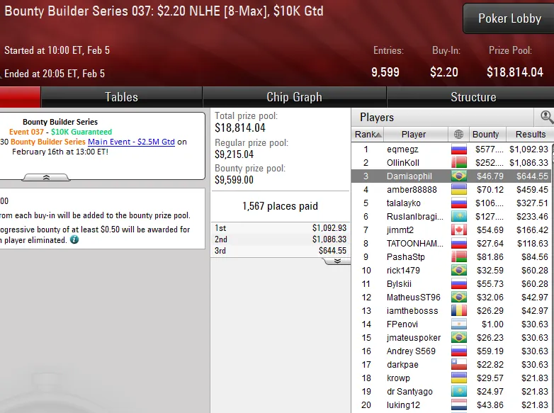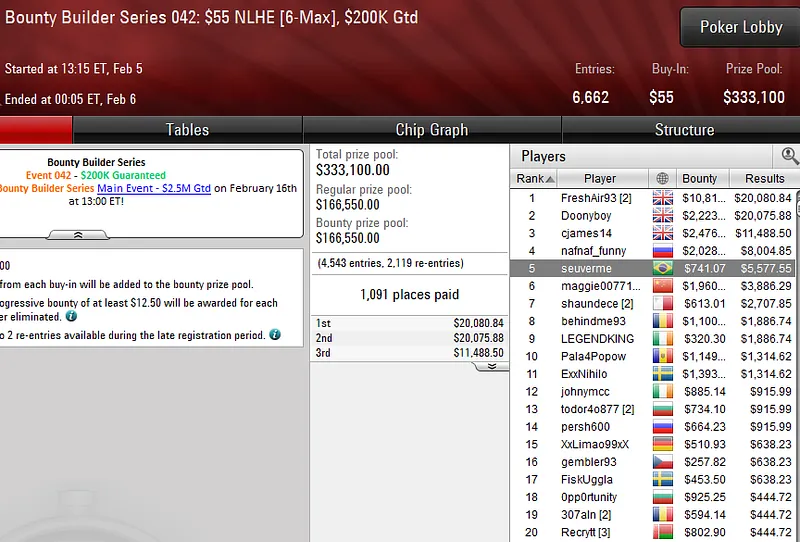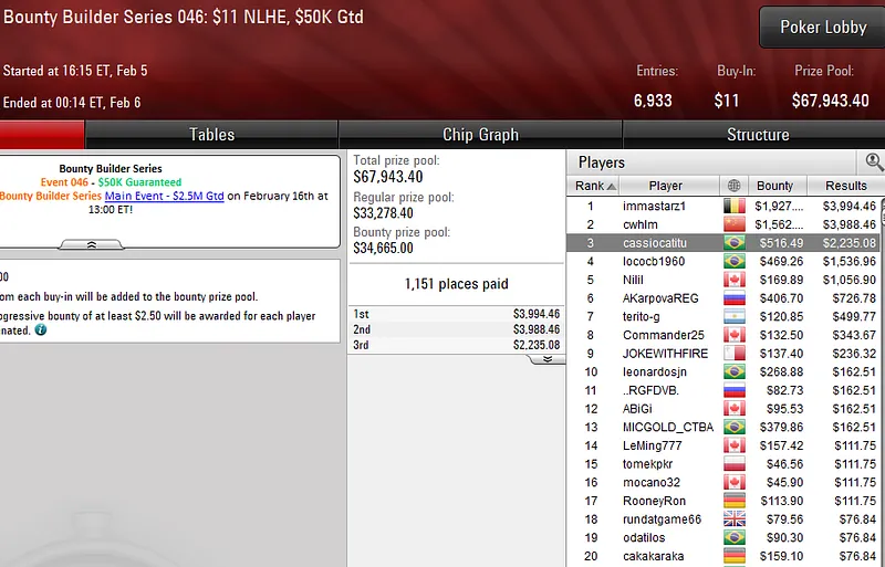 Pilotando a conta vitinhorrn15, o carioca levou a melhor no Bounty Builder Series 045: US$ 109 NLHE e embolsou uma bela premiação de cinco dígitos. O evento registrou 2.713 entradas e o brasileiro despachou toda a concorrência em quase nove horas de jogo para subir ao topo do pódio e receber US$ 30.334.