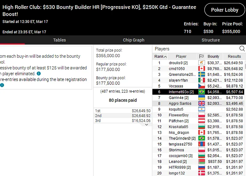 Outro brasileiro que também forrou cinco dígitos High Roller Club foi Renan "Internett93o" Bruschi. O craque foi o sexto melhor entre os 710 participantes no US$ 530 Bounty Builder HR PKO e engordou o bankroll com um prêmio de US$ 10.566.
