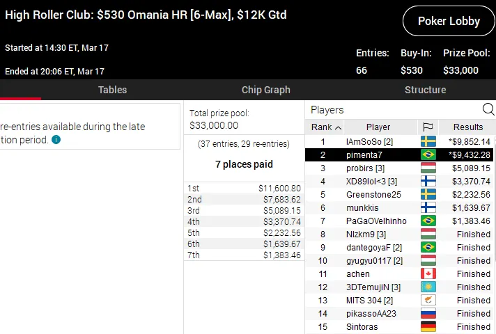 Brunno Botteon foi o jogador que garantiu a maior premiação para o país. Pilotando a conta "botteonpoker", o grinder brasileiro reservou um lugar na mesa final do High Roller Club: US$ 1.050 Super Tuesday e terminou na quinta colocação entre um field de 186 entradas receber um prêmio de US$ 12.751.