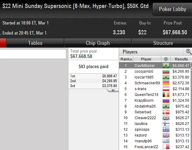 Já Bernardo "bedias" Dias encaixou uma premiação de cinco dígitos no High Roller Club do PokerStars. O brasuca foi terceiro colocado entre um field de 1.218 entradas no US$ 530 Bounty Builder HR PKO e levou a forra de US$ 25.901.
