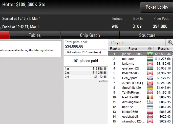 Luís Eduardo "EduardoGarl@" Garla foi o grande campeão do Bounty Builder US$ 109 e garantiu uma das maiores premiações do dia. O profissional brasileiro despachou um field de 3.657 entradas em pouco mais de dez horas de jogo e subiu ao topo do pódio para receber US$ 36.391.