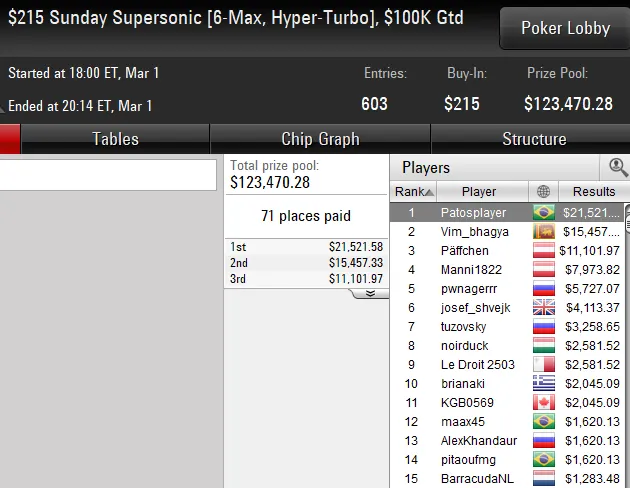 Outro dos grandes destaques da sessão de ontem foi Peter Patrício, com duas medalhas de prata para mais de US$ 40 mil em premiações. No PokerStars, site onde pilota a conta pitaoufmg, o brasuca foi segundo colocado no Bounty Builder US$ 215 e faturou US$ 20.545.