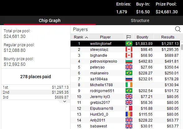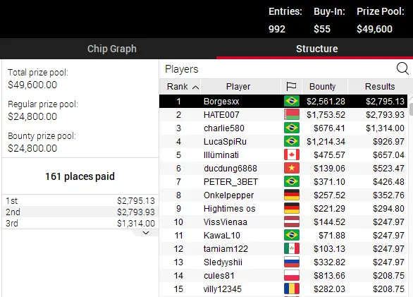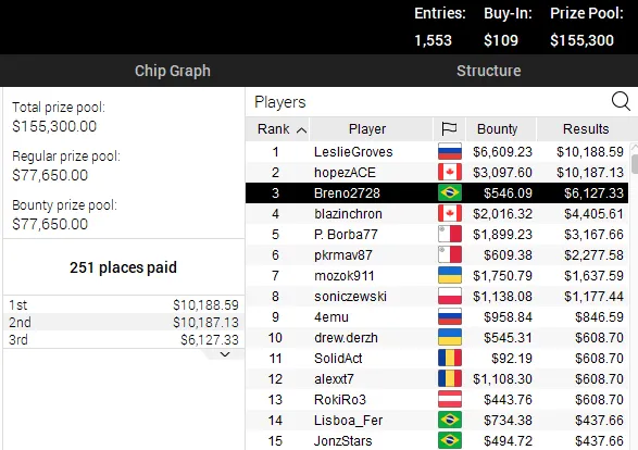 Já no Bounty Builder US$ 162, torneio que registrou 297 entradas e mais de $44 mil em premiações, Regis "Regis R69" Cardoso garantiu mais um título para o Brasil. O desempenho rendeu ao brasuca uma premiação total de US$ 9.375.