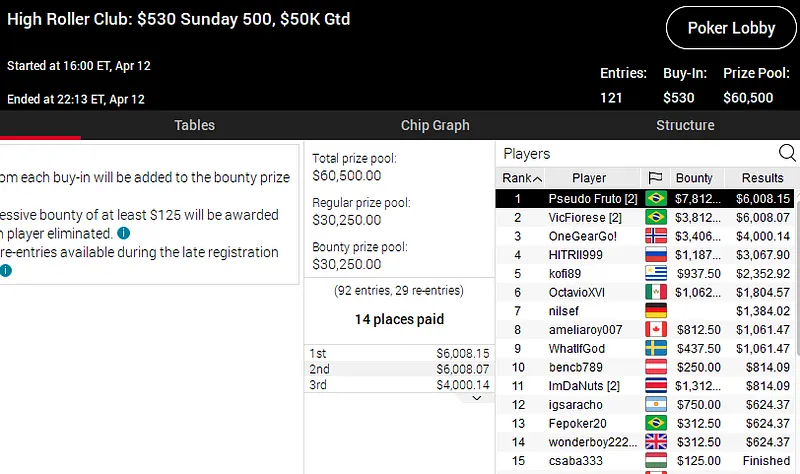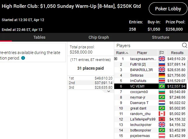 Dante Goya foi outro dos brasileiros em grande destaque na reta online domingo. O craque conquistou ouro e prata no High Roller Club e embolsou mais de US$ 47 mil em premiações nos torneios mais caros do PokerStars.