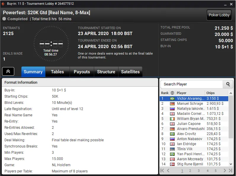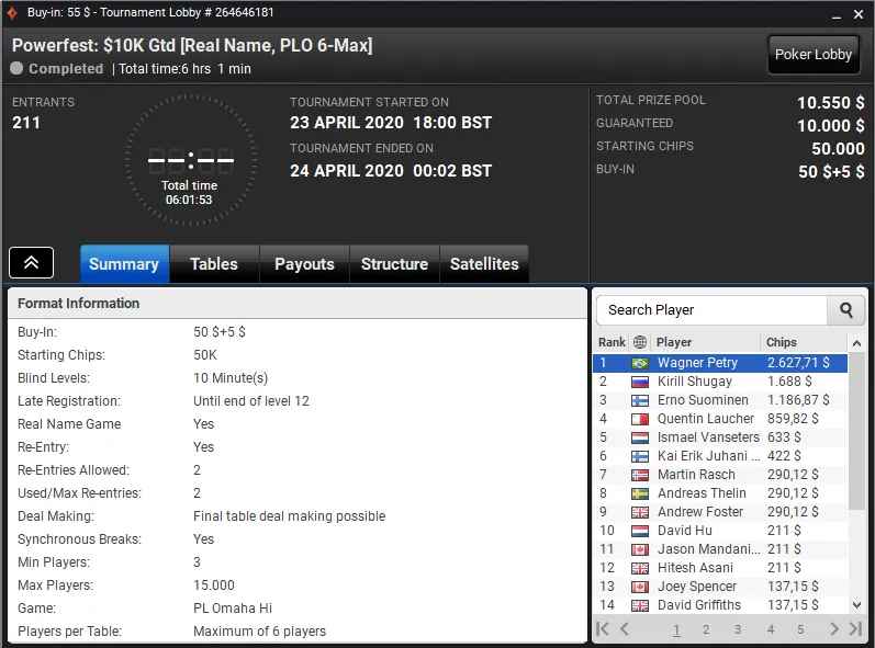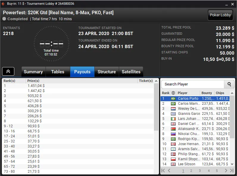 Outros dos títulos desta quinta para o Brasil veio no Powerfest: US$ 75K Gtd [8-Max, Deepstack]. Este evento viu um field de 167 entradas na briga por uma fatia de US$ 83.500 e foi Felipe Boianovsky quem levou a maior fatia do bolo. A vitória rendeu ao brasuca US$ 18.479.