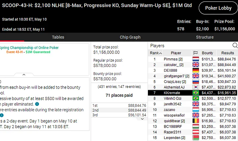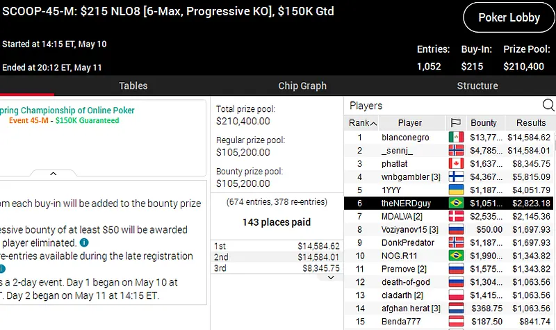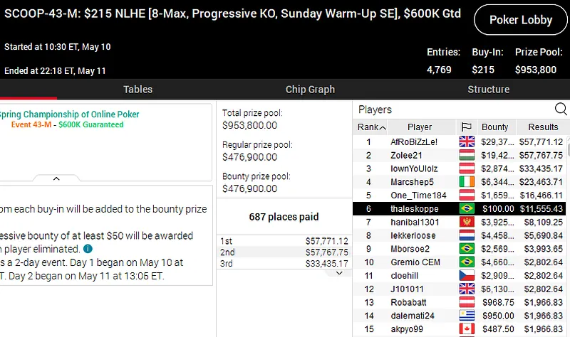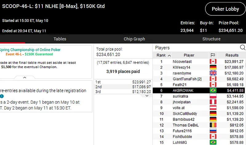 Quem também forrou uma bela premiação de cinco dígitos foi o brasuca dono da conta "GiveMeTwOutS". O grinder colocou a bandeira verde e amarela no terceiro lugar do pódio do SCOOP-46-M: US$ 109 NLHE [8-Max] e viu seu desempenho recompensado com US$ 57.148.