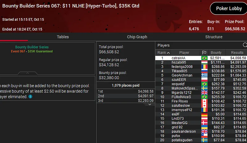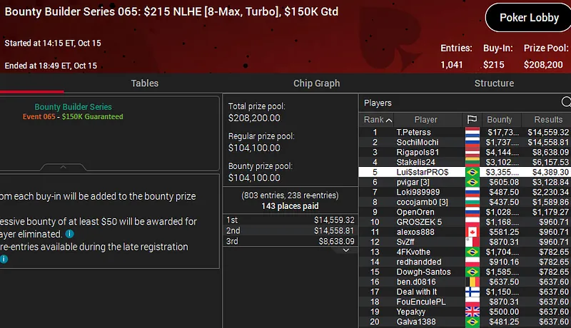 Quem também ficou muito perto de soltar o grito de campeão na série do PokerStars foi o jogador que pilota a conta "Staute". O grinder brasileiro foi o segundo melhore entre um field de 6.399 entradas no Bounty Builder Series 063: US$ 55 NLHE [8-Max] e conquistou a medalha de prata que veio acompanhada por um prêmio de US$ 22.794.