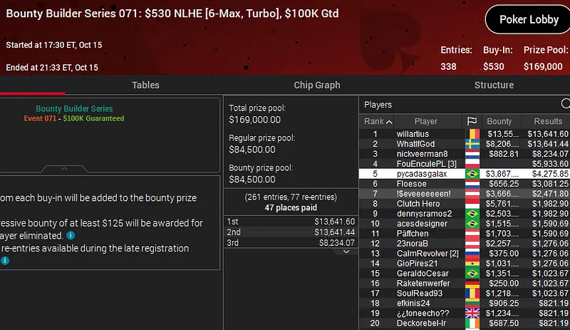 Já no Bounty Builder Series 066: US$ 22 NLHE [8-Max, Turbo], Sérgio Pereira colocou a bandeira verde e amarela no segundo lugar do pódio e também embolsou uma premiação de cinco dígitos.