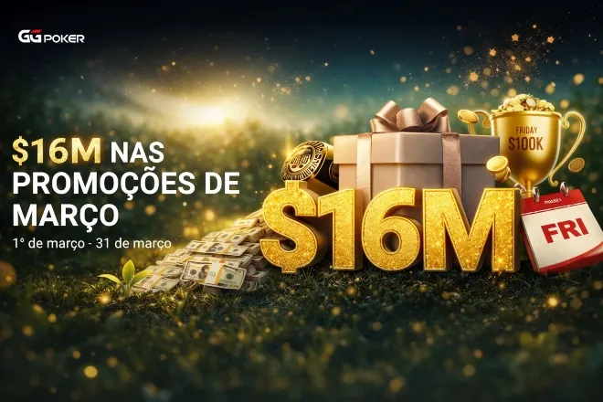 A GGPoker lançou uma promoção especial para março, oferecendo US$ 16 milhões em recompensas distribuídas ao longo de todo o mês para jogadores da plataforma. A campanha é composta por rankings globais, tickets para festivais como a WSOP Super Circuit e diversas recompensas voltadas tanto para profissionais quanto para recreativos.