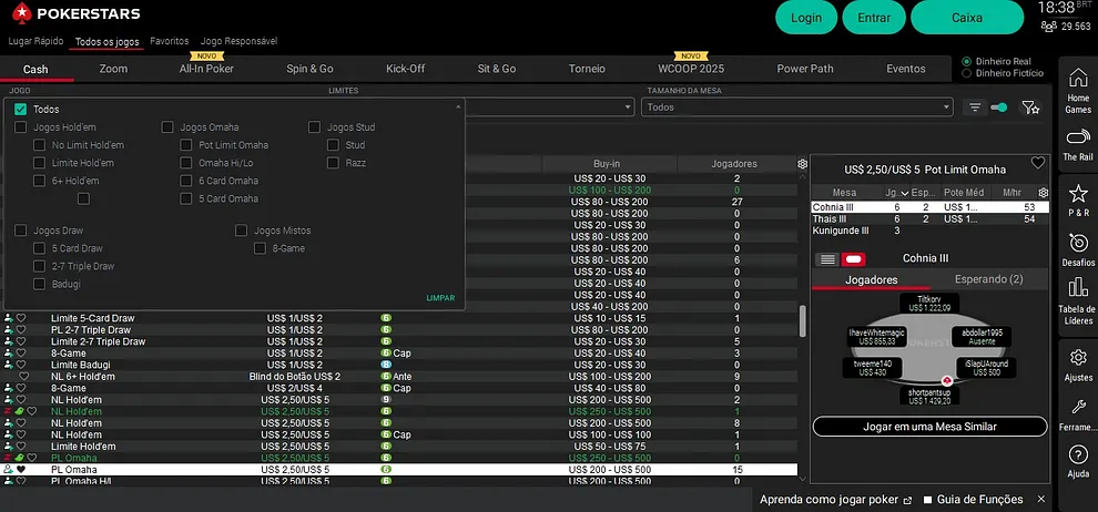 Todas as opções: Hold'em, Omaha, Stud, Mixed Games, Zoom, Spin & Go, Sit & Go e mais