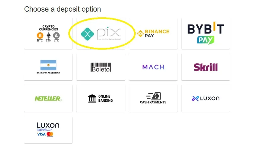 O valor mínimo de depósito varia segundo o método escolhido (no Pix, por exemplo, é de R$ 50), assim como as taxas de transação. As opcões incluem: